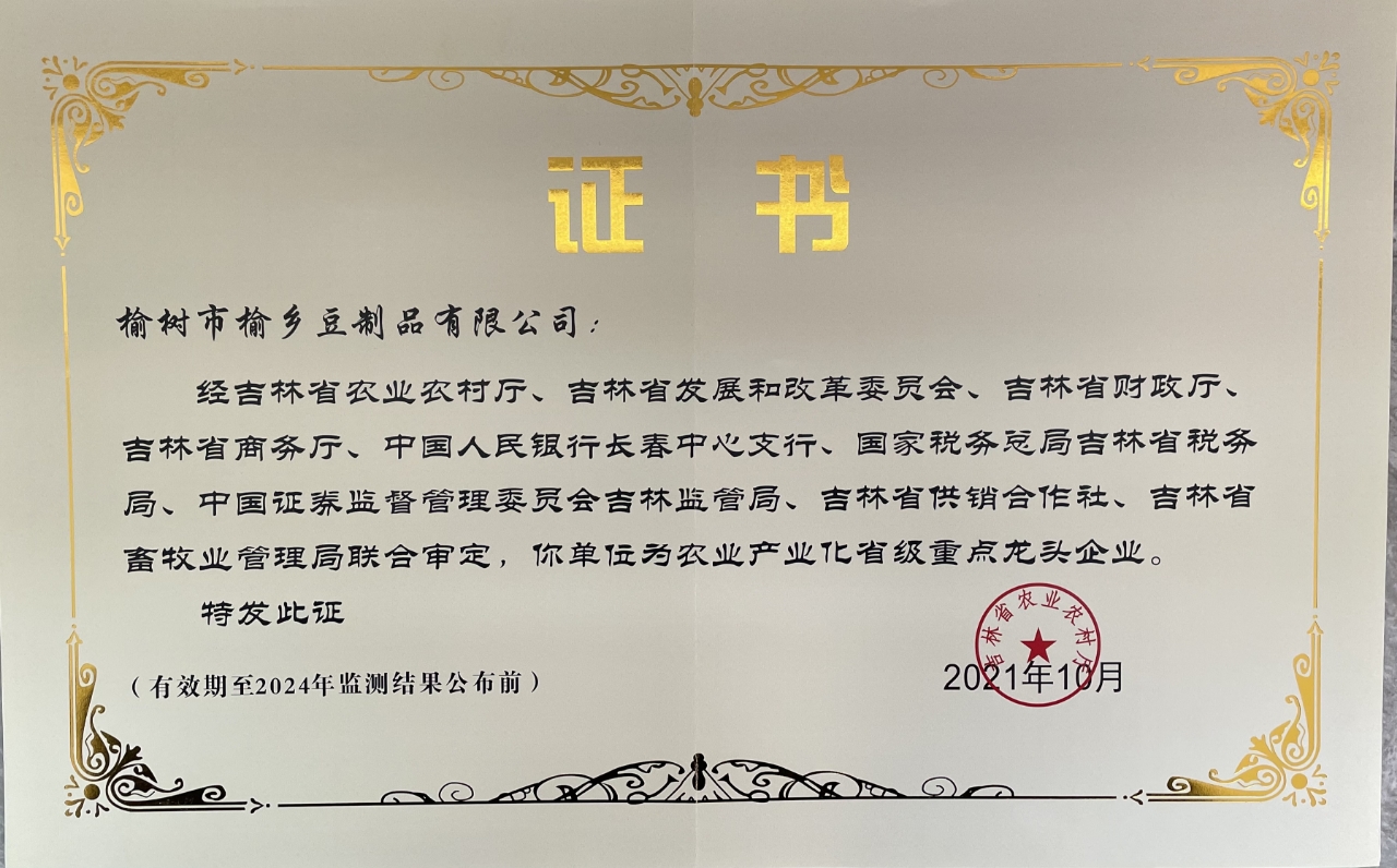 榆乡牌豆腐以形薄如纸闪金光而家喻户晓,其生产方式打破了传统小作坊式生产格局,有效地保证了食品安全,榆乡牌豆腐现已逐渐地成为榆树市地标性农产品和最有长春味土特产,“榆乡”牌豆腐被评为长春市著名商标。